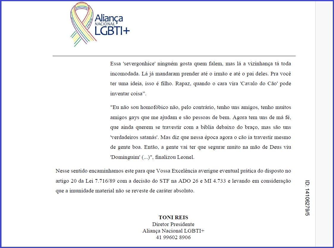 A representação que deu origem ao processo foi protocolada pela Aliança Nacional LGBTI+ em 22 de agosto daquele ano, após a divulgação de um vídeo onde o vereador, ao se referir a um cidadão, afirmou: “um rapaz que eu não sei se é gay, mas eu acho que ele é […], essa ‘severgonhice’ ninguém gosta […] inventar coisa”. Em outro trecho, Leonel ainda teria se referido a membros da comunidade LGBTI+ como “uns de má fé” e “verdadeiros satanás”.