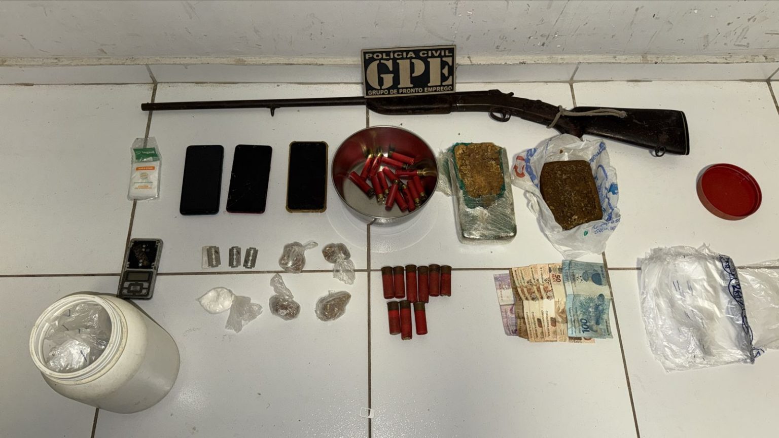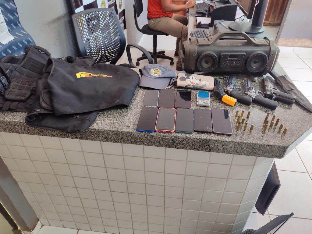 No interior da casa, mais cinco pessoas foram localizadas e revistadas. Após buscas no imóvel, foram apreendidos: outro revólver calibre .38, uma pistola marca Imbel, um simulacro de arma de fogo, uma balança de precisão, nove aparelhos celulares de diferentes marcas, dois coletes balísticos, uma cobertura com identificação da Polícia Militar do Maranhão, três motocicletas (sendo uma com registro de roubo em Peritoró/MA), além de um facão, uma caixa de som, documentos pessoais, um cartão de crédito, uma televisão e um monitor.